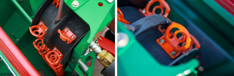 4、将种薯碗设计成三种不同大小的可更换式,交错等间距地排列安装于排种器薯种带上,碗勺的背面设有翻边。使其适应种薯的范围得到了扩大,由传统的30-50克,扩大到了15-80克。